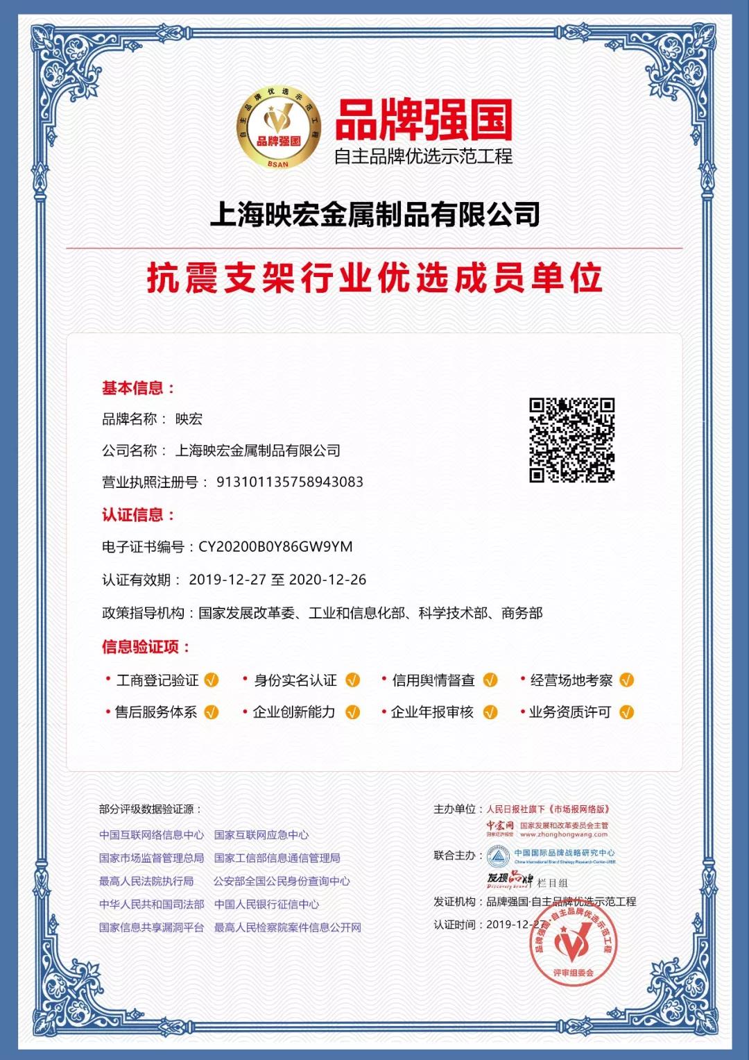 经由品牌强国示范工程深圳地区运营中心审核、认证、社会公示,“映宏”符合示范工程评选标准,成功入选为品牌强国示范工程抗震支架行业优选成员单位,企业信息录入品牌强国示范工程数据库,在国家级平台展示品牌形象。